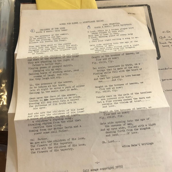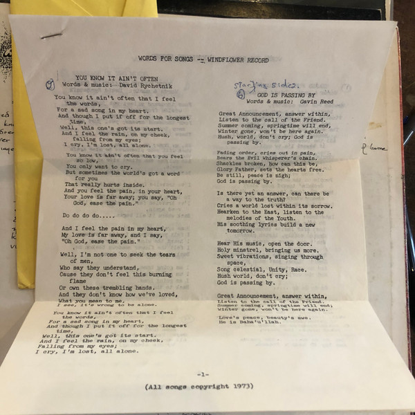 Гэвин Рид: "Эта группа образовалась на Аляске в конце 1972 года. Все участники принадлежали к вере Бахаи, и многие концерты, которые давала группа, были связаны с мероприятиями общины бахаи... Windflower записали и выпустили один альбом с оригинальным материалом в 1973 году в Studio 70 в Мюнхене, Западная Германия, во время европейского турне (также связанного в то время в основном с мероприятиями Бахаи), которое включало выступления в Германии, Англии, Австрии, Лихтенштейне, Швейцарии, Израиле, Норвегии и Финляндии. Альбом был издан частным образом и выпущен в начале 1974 года. До возвращения на Аляску и ухода из профессиональной музыки группа также выступала на различных площадках в Оклахоме, Гавайи. Участники группы, включая Гэри Ламара, Маршалла Мерфи и Гэвина Рида, а также вокалистку Барбару Тейлор, в течение ряда лет давали случайные концерты в Анкоридже, Аляска, пока все они там проживали, вплоть до середины 1990-х". (Автоматический перевод)