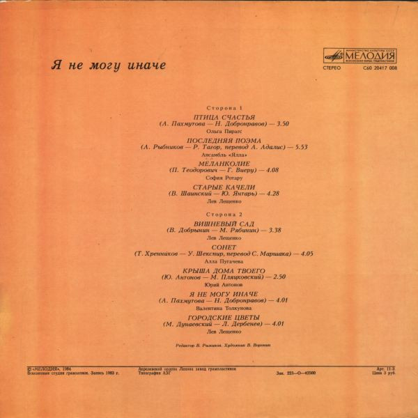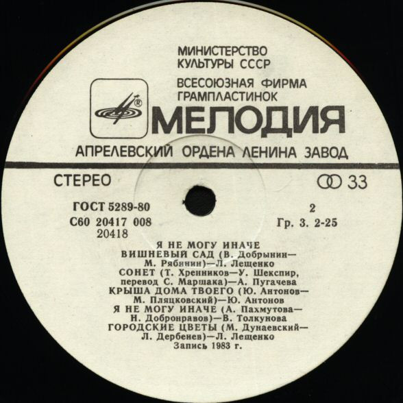 Всесоюзная студия грамзаписи. Запись 1983 г.