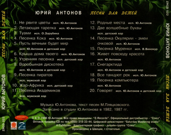 1 Ю. Антонов – Не рвите цветы 2 Ю. Антонов – Летающая тарелка 3 О. Зарубина – Туами 4 Ю. Антонов – Песенка кока 5 Ю. Антонов и Детский Хор – Пусть вечным будет мир 6 Ю. Антонов – Крыша дома твоего 7 Детский Хор – Утренняя песенка 8 Ю. Антонов и Детский Хор – Воробьиная дискотека 9 Мужской Хор – Песенка пиратов 10 Детский Хор – Жар-Африка 11 Мужской Хор – Песенка академиков 12 Ю. Антонов – Родные Места 13 Детский Хор – Две волшебные буквы 14 Ю. Антонов – Песенка Окулярии - змеи очковой 15 В. Винокур – Песенка Муренки 16 Ю. Антонов – Живет повсюду красота 17 Ю. Антонов и Детский Хор – Снегарктида 18 Ю. Антонов – Все танцуют рок 19 Ю. Антонов – Песенка компьютера 20 Юрий Антонов и Детский Хор – Говорят
