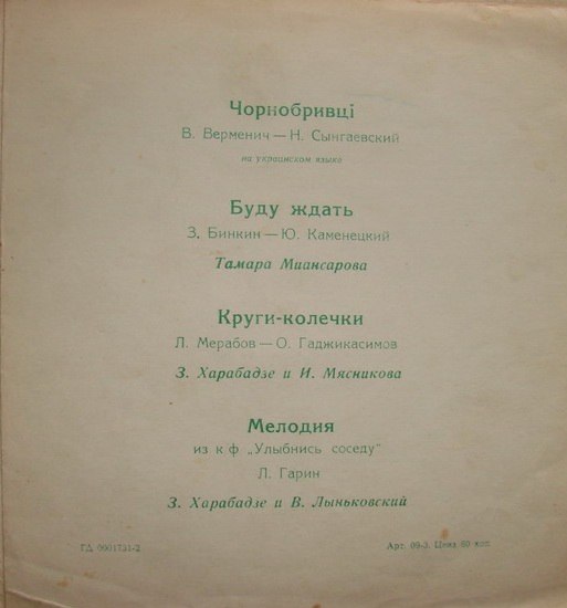 - Песня «Чорнобривці» на украинском языке, которая выходила на гибкой пластинке в 1969 году. Эта запись оцифрована, непосредственно, с носителя и выложена на Ютубе. Сама композиция использована в фильме-концерте «Солнечная баллада», но тамошнее качество мешает разобрать половину слов...