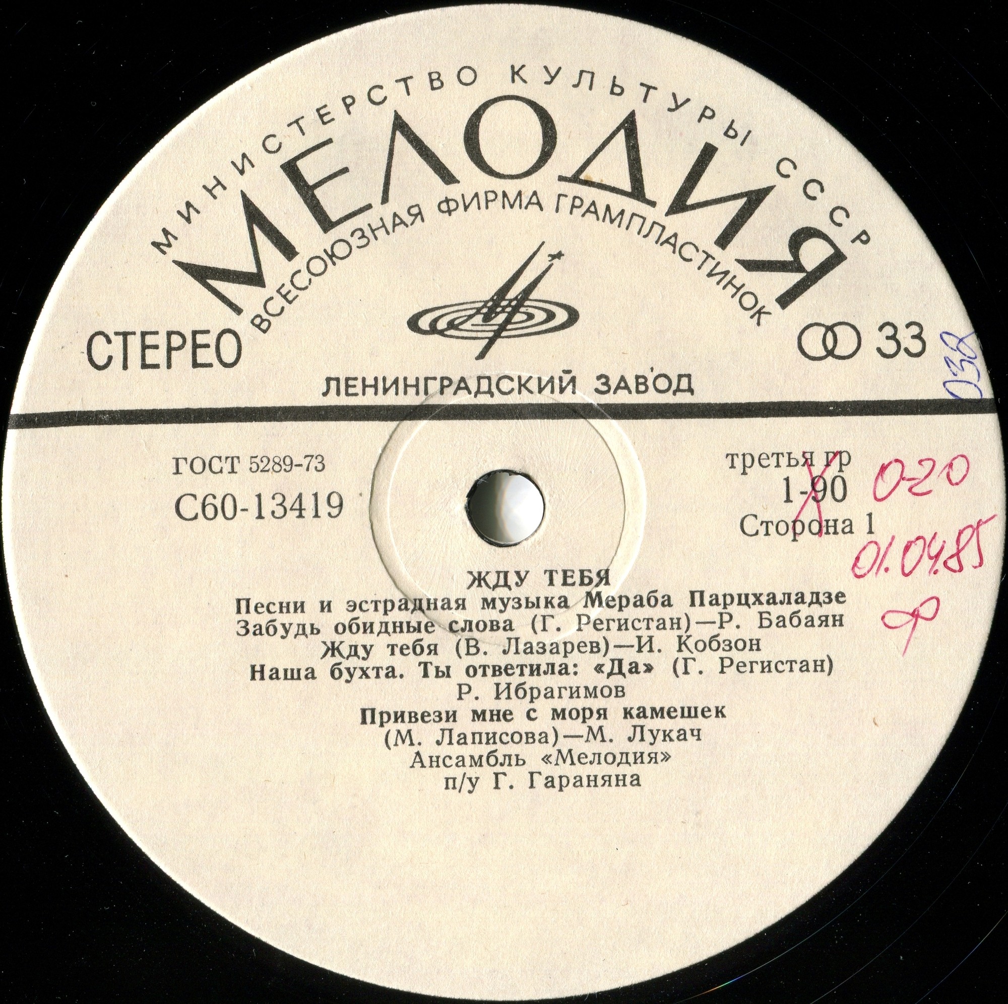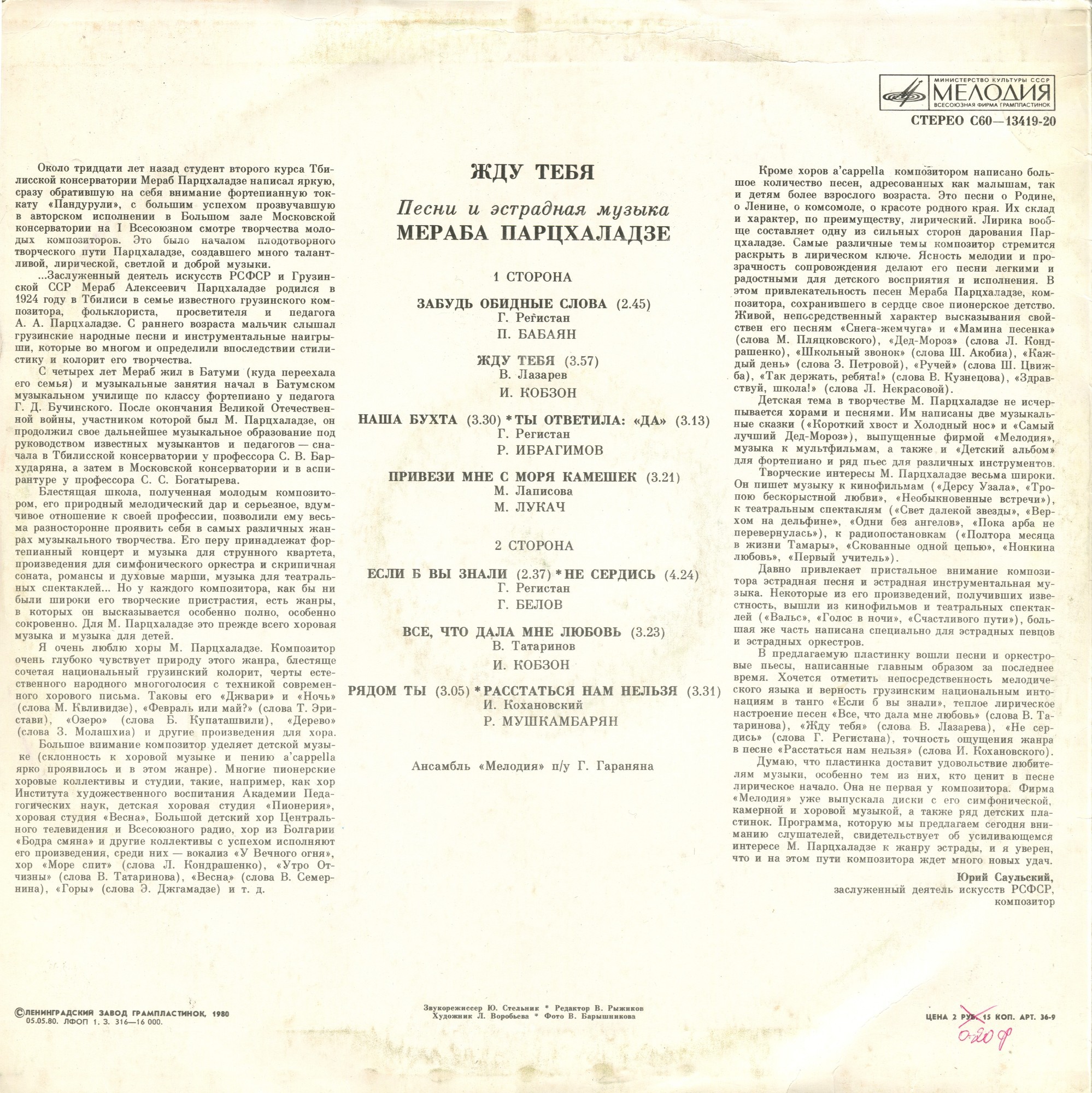 1 СТОРОНА 01.ЗАБУДЬ ОБИДНЫЕ СЛОВА (М.Парцхаладзе-Г.Регистан) Р. БАБАЯН 02.ЖДУ ТЕБЯ (М.Парцхаладзе-В.Лазарев) И. КОБЗОН 03.НАША БУХТА (М.Парцхаладзе) 04.ТЫ ОТВЕТИЛА ДА (М.Парцхаладзе-Г.Регистан) Р. ИБРАГИМОВ 05.ПРИВЕЗИ МНЕ С МОРЯ КАМЕШЕК (М.Парцхаладзе-М.Лаписова) М. ЛУКАЧ