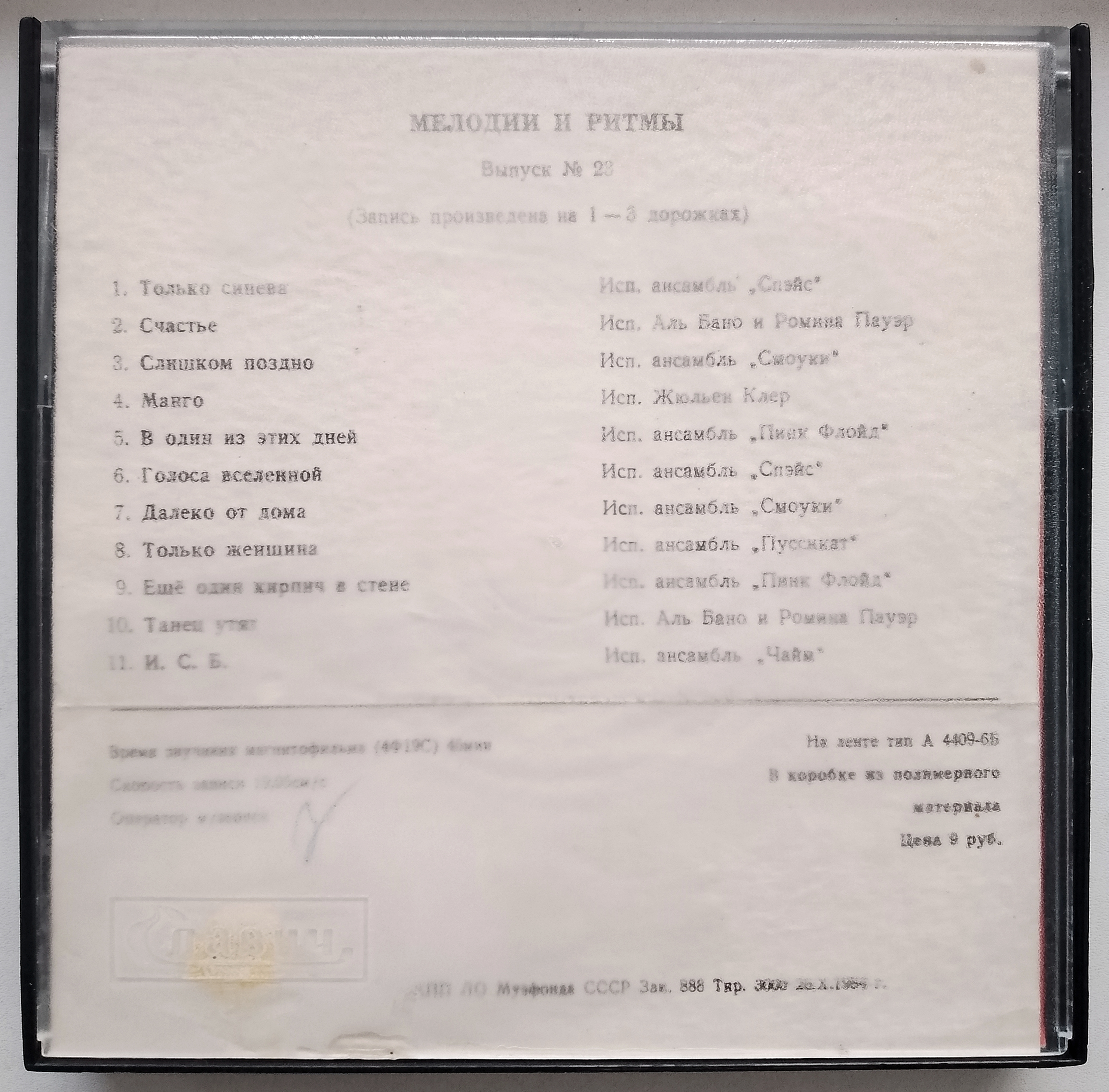 Магнитофильм Ленинградского отделения Музыкального фонда СССР. "Мелодии и Ритмы".Выпуск 23. Октябрь 1984 года. Оригинальная запись сохранилась полностью. Пластиковый бокс с листком-вкладышем испо...